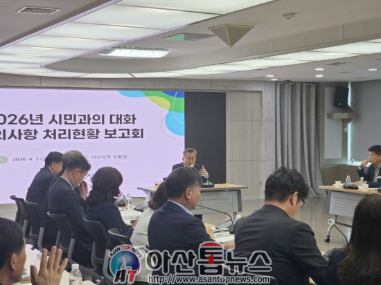 충남 아산시(시장 오세현)는 지난 3일 부시장 주재로 국·소장, 관련 부서장, 그리고 17개 읍·면·동장이 참석한 가운데 ‘2026년도 시민과의 대화 건의사항 추진상황 보고회’를 가졌다고 밝혔다.
