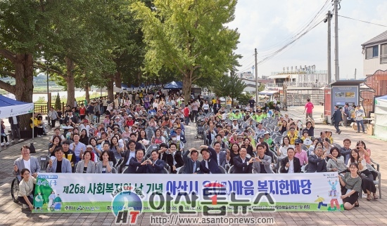 ▲ 지난해 열린 사회복지의 날 기념 ‘아산시 온마음 복지한마당’ 행사장에서 참가자들이 기념촬영을 하고 있다. © 아산톱뉴스