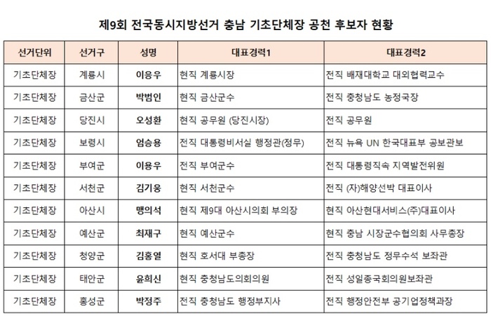 국민의힘 충남도당 공천관리위원회(이하 공관위)는 제9회 전국동시지방선거 기초단체장 11개 선거구 후보자 11명의 공천을 확정했다.