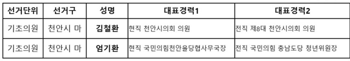 ▲가 선거구는 신미진 아산시의원과 이기애 아산시의원 ▲나 선거구는 박효진 아산시의원과 이윤규 국힘 중앙당 부대변인 ▲다 선거구는 윤원준 아산시의원과 정두기 전 국힘 아산 갑 사무국장 ▲라 선거구는 권석주 전 아산시 탕정면 매곡1리 이장과 전남수 아산시의원 ▲마 선거구는 김은아 아산시의원, 최민수 충남도 정책 특별보좌관, 최봉섭 아산배방푸르지오아파트 회장 ▲바 선거구는 윤예숙 유원대학교 협력교수와 홍순철 아산시의원이 각각 경선을 치른다.