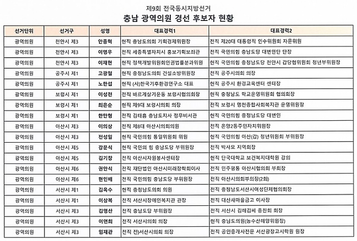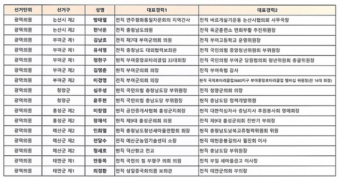 이 외 타 시·군 광역의원 경선 선거구는 ▲천안 3 ▲공주 1 ▲보령 1 ▲서산 1, 3 ▲논산 2 ▲부여 1, 2 ▲청양 ▲홍성 2 ▲예산 2 ▲태안 1이다.