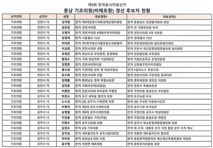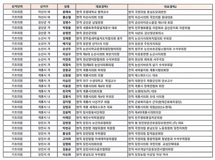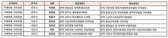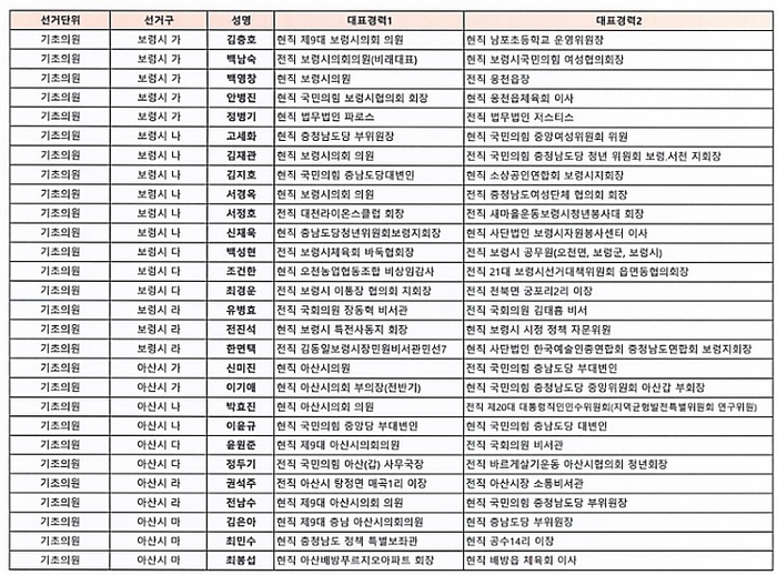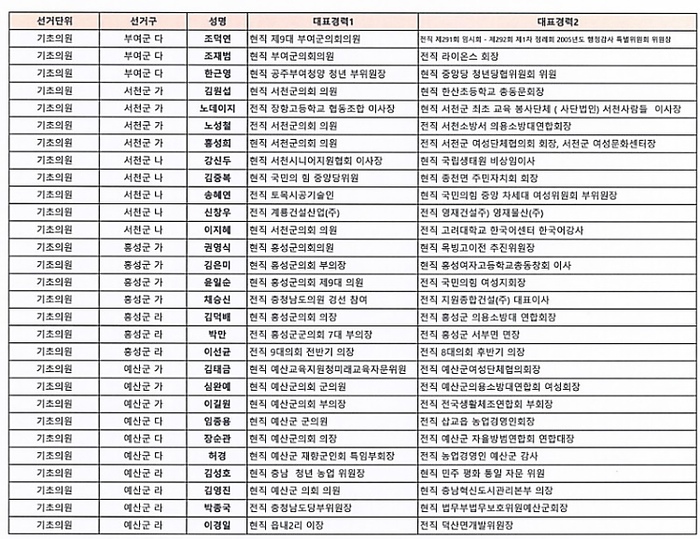 기초의원 경선 선거구는 ▲천안 다, 라, 마, 사, 자, 차, 카 ▲공주 가, 나, 다 ▲보령 가, 나, 다, 라 ▲금산 가 ▲논산 가 ▲계룡 가, 나 ▲당진 가, 라 ▲부여 다 ▲서천 가, 나 ▲홍성 가, 라 ▲예산 가, 다, 라 ▲공주시 비례대표 ▲서산시 비례대표이다.