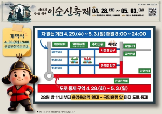 충남 아산시(시장 오세현)는 ’제65회 아산 성웅 이순신축제‘ 기간 중 원활한 행사 운영을 위해 오는 4월28일 밤 11시부터 5월3일까지 온양온천역 일원 교통통제를 실시한다.