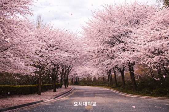 호서대는 벚꽃 시즌을 맞아 다양한 이벤트와 문화 프로그램을 운영하고 있다. 오는 7일 저녁에는 강석규교육관 외벽을 활용한 미디어파사드가 진행되며, 성재도서관 6층 갤러리에서는 김시현 작가 초대전 아우르다21일까지 무료로 관람할 수 있다.