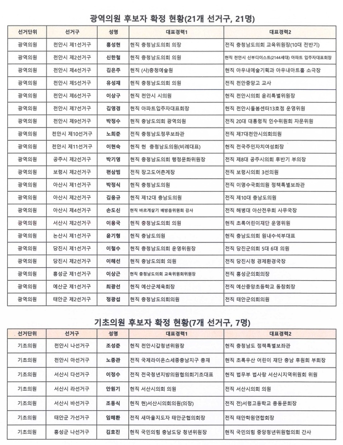 기초의원 후보 확정 선거구는 △천안 나, 아 △서산 다, 라, 바 △태안 가 △홍성 나이다.